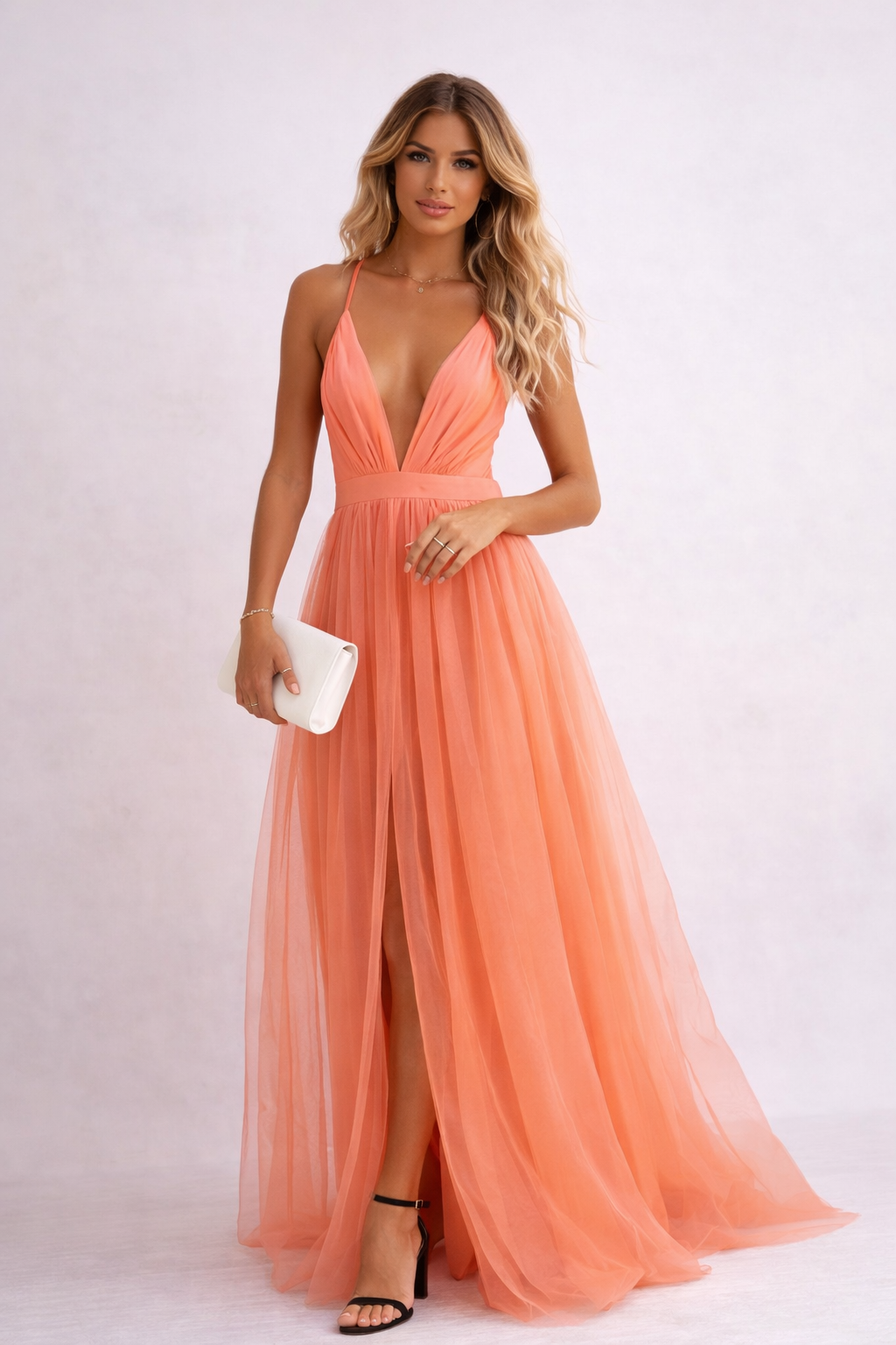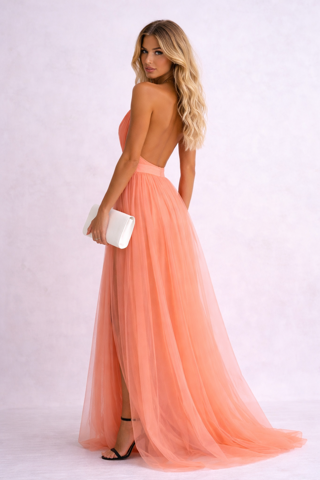Son décolleté subtil et sa fente élégante apportent une touche d’audace, tandis que le dos ouvert délicatement structuré révèle une allure sophistiquée et inoubliable.